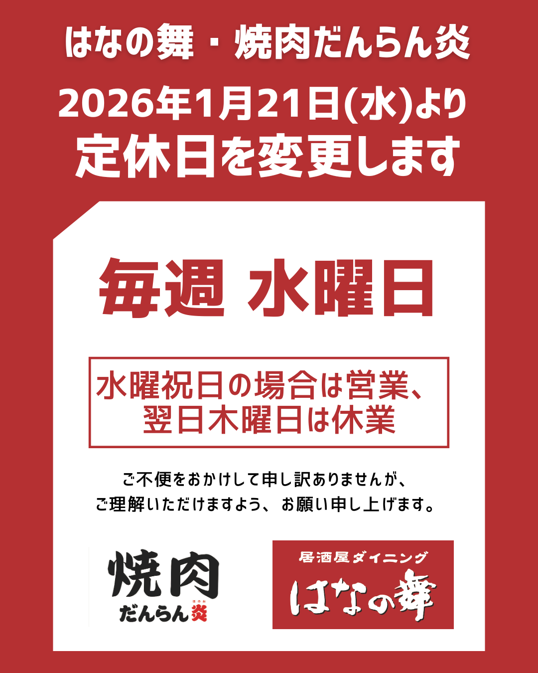 2026年1月21日(水)より、お食事処(はなの舞・焼肉だんらん炎)の定休日を変更いたします。